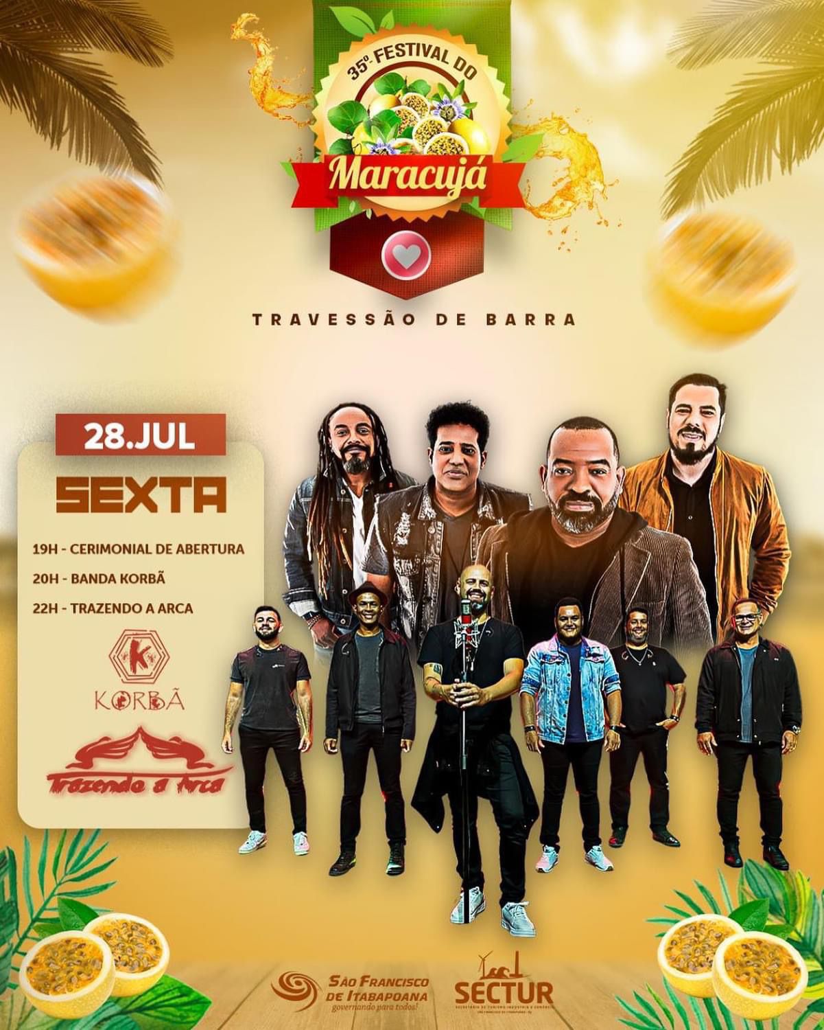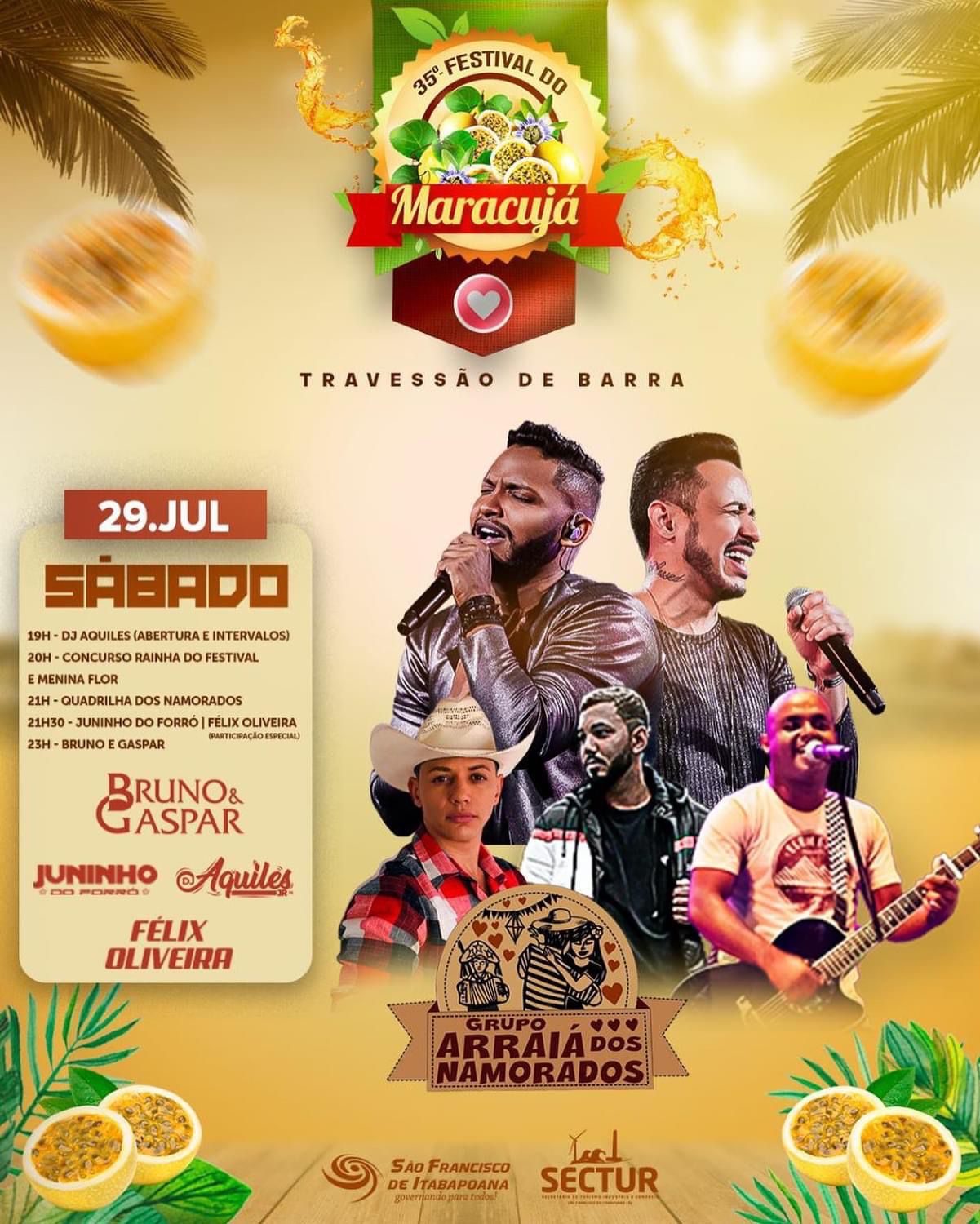 A Prefeitura de São Francisco de Itabapoana (SFI) divulgou a programação oficial da 35ª edição do Festival do Maracujá, que será realizado em Travessão de Barra, entre os próximos dias 28 e 30 de julho, com entrada franca. Durante os três dias do evento, que tem o apoio da Secretaria Municipal de Turismo, Indústria e Comércio, haverá shows, dança de quadrilha e concurso de beleza.