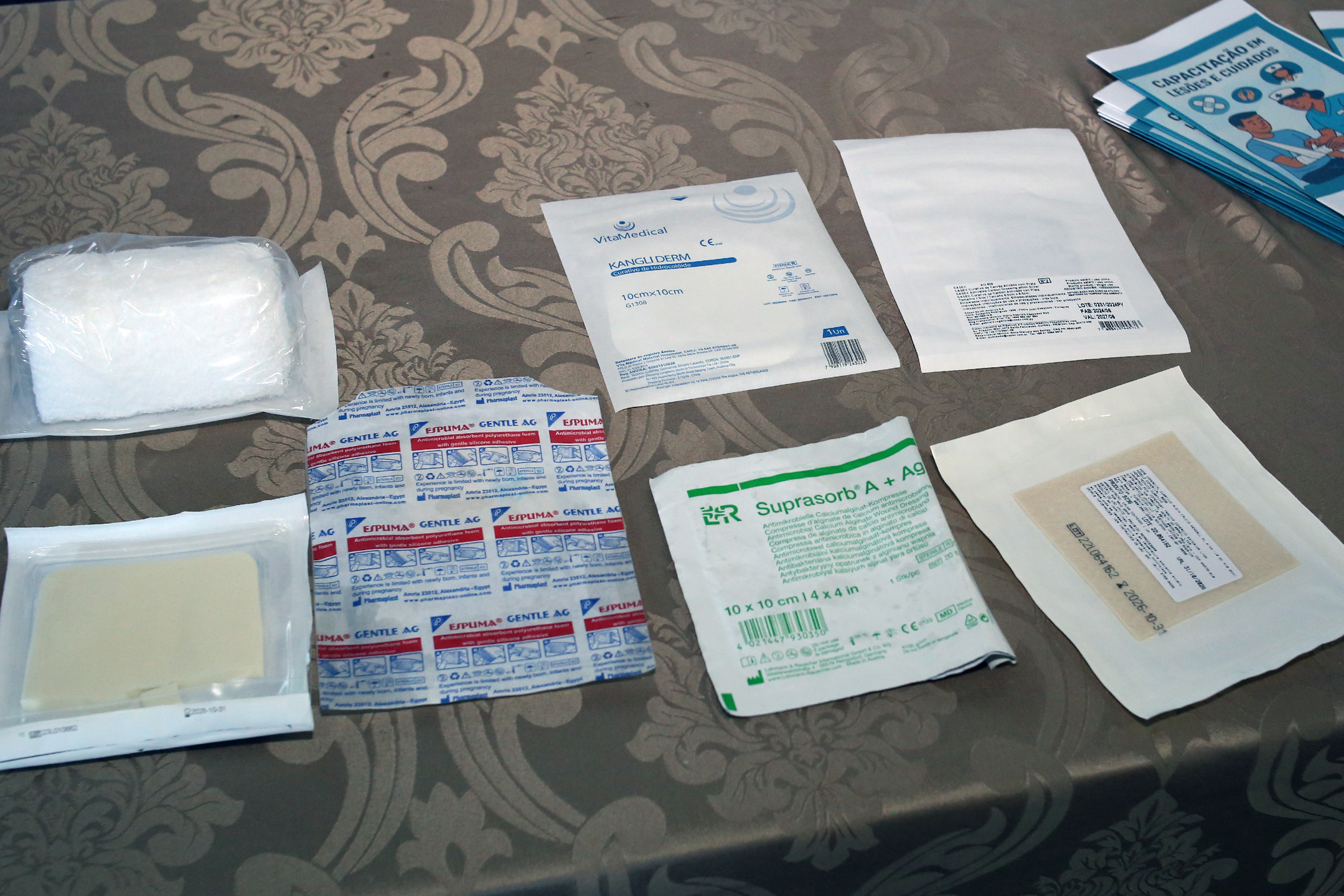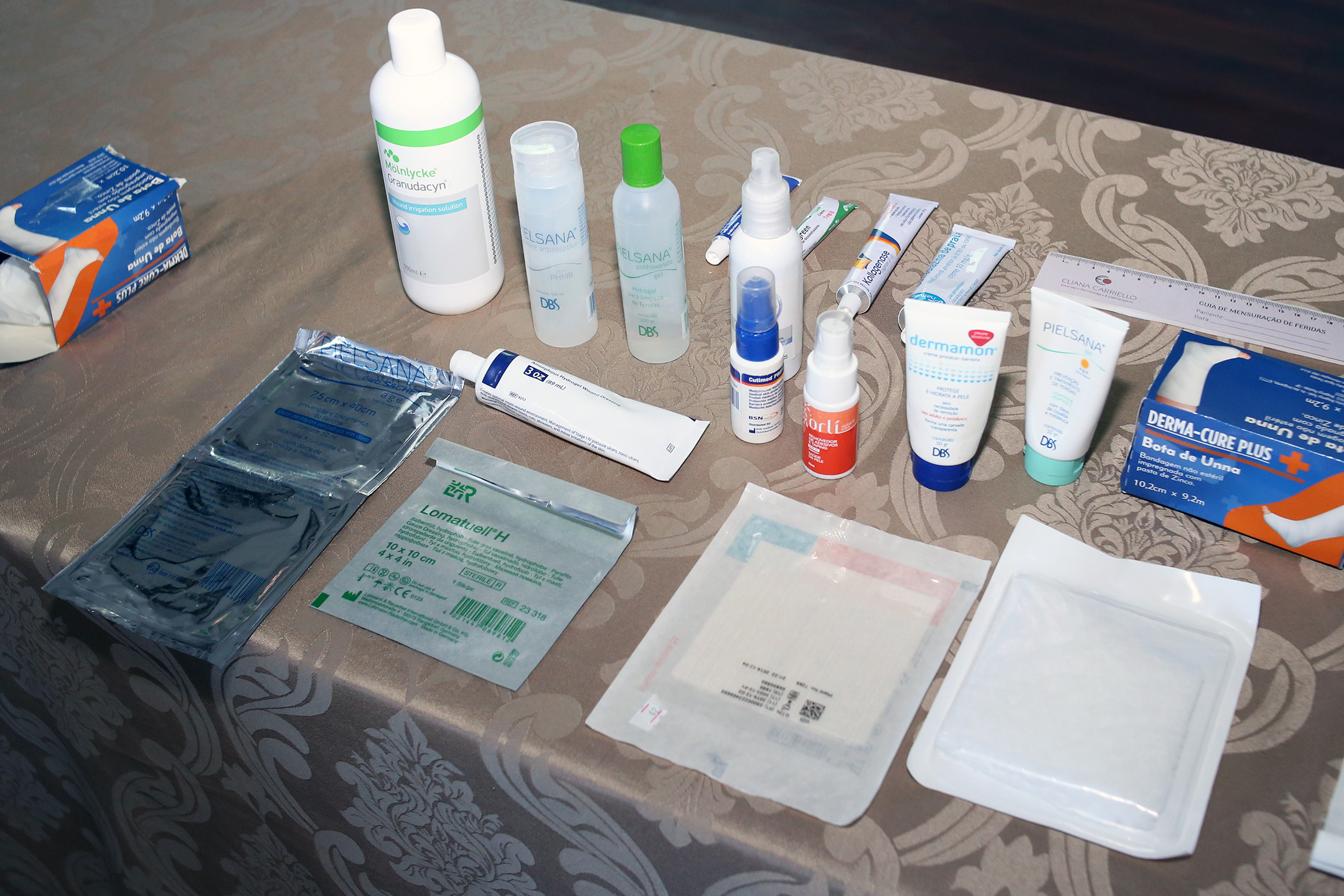 Durante a aula prática, os profissionais acompanharam a abordagem de uma paciente com lesão, recebendo orientações sobre higiene, manuseio de medicamentos e o uso adequado dos materiais para curativos, sob a supervisão da enfermeira Eliana Carriello.