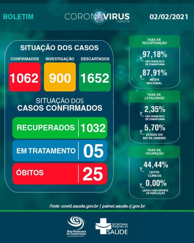 Atualmente, SFI está com taxa de recuperação em 97,18%, superior a média nacional (87,91%). Já a taxa de letalidade está em 2,35%, enquanto que a do Estado do Rio de Janeiro é de 5,70%.