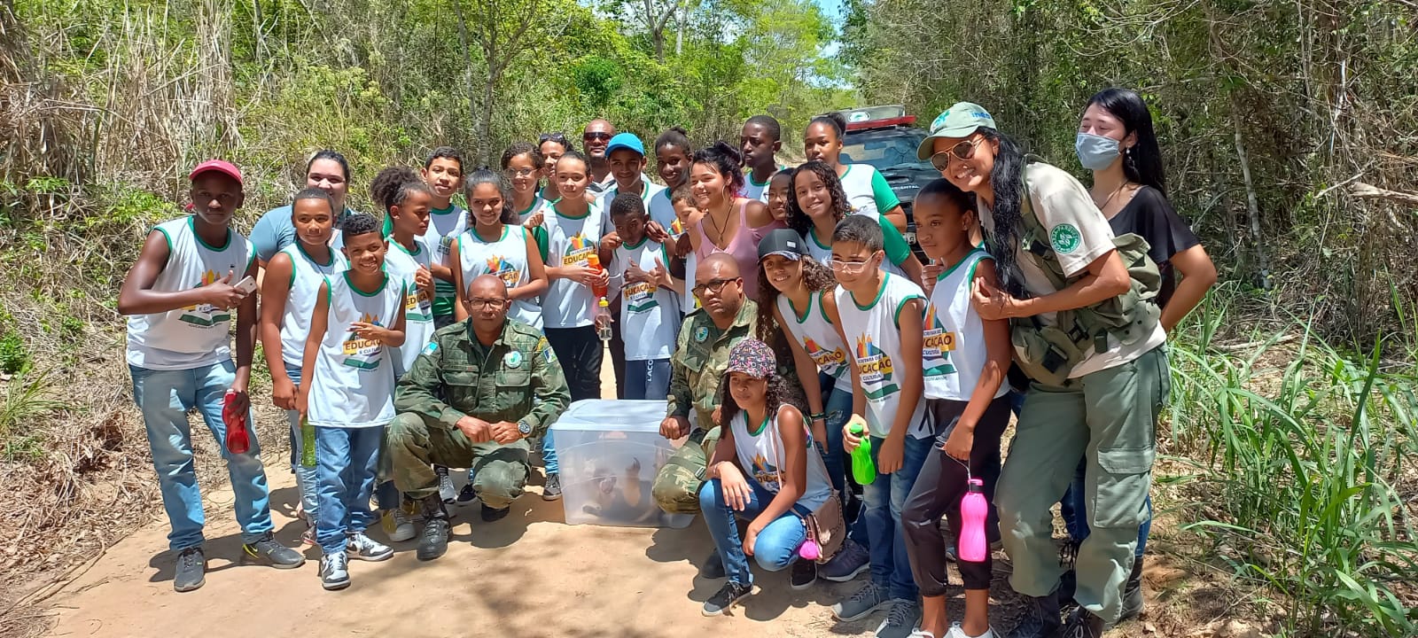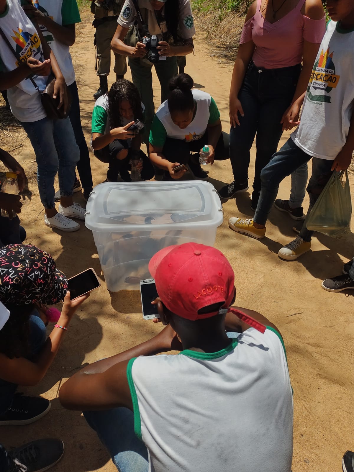 “Fato inusitado é que um grupo de alunos de uma escola municipal estava visitando a unidade de conservação, o que acabou despertando a curiosidade dos estudantes, que manifestaram o desejo de ver o animal, antes da soltura, dentro da caixa transparente de transporte”.