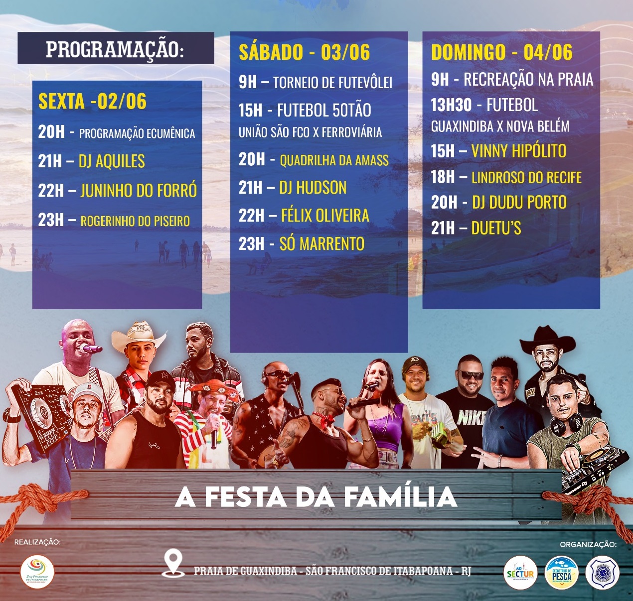 O cronograma de atividades começará na sexta-feira (2), às 20h, com ato ecumênico. Em seguida, vão se apresentar DJ Aquiles, Juninho do Forró e Rogerinho do Piseiro. No sábado (3), além dos shows, haverá torneio de futevôlei e Futebol 50tão. Já no domingo (4), recreação na praia, seguida de futebol e shows.